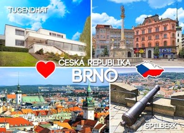 Vila Tugendhat, morový (mariánský) sloup na náměstí Svobody, pohled na Brno, dělo na hradu Špilberk a nápisy Tugendhat, Špilberk, Brno a Česká republika s mapou České republiky a srdcem.