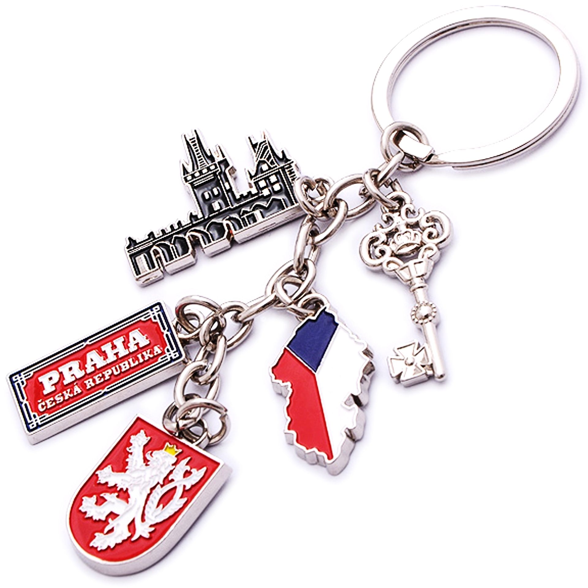 Přívěsek (klíčenka) Praha a ČR – symboly Prahy (Karlův most a Malostranské mostecké věže, uliční cedule, klíč k městské bráně) a mapa ČR.